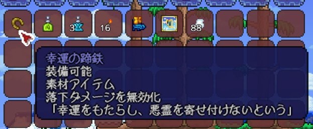 また、幸運の蹄鉄を風船と合成した上位アクセサリーは、初期はもちろん、ハードモード突入前まですごく重宝しました。